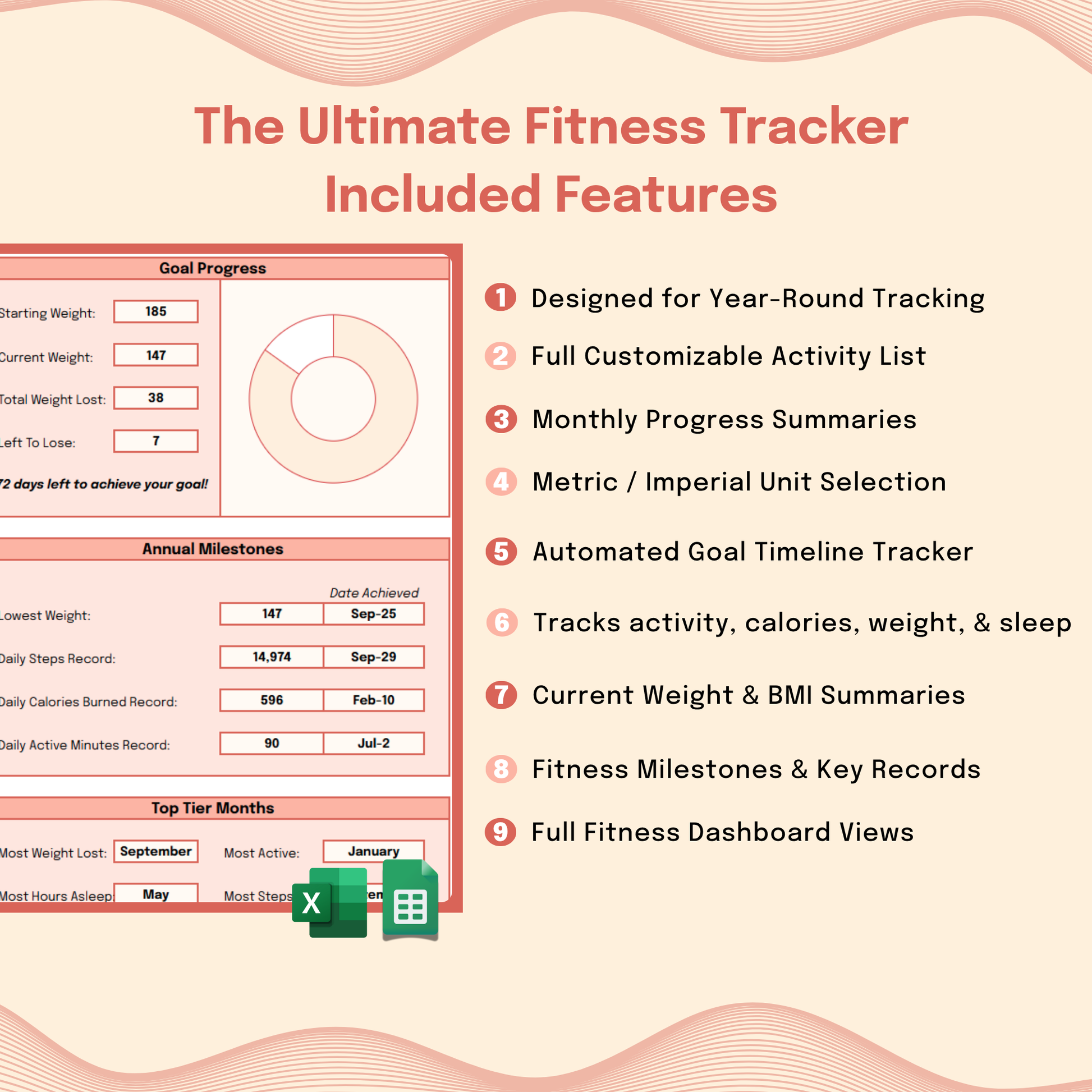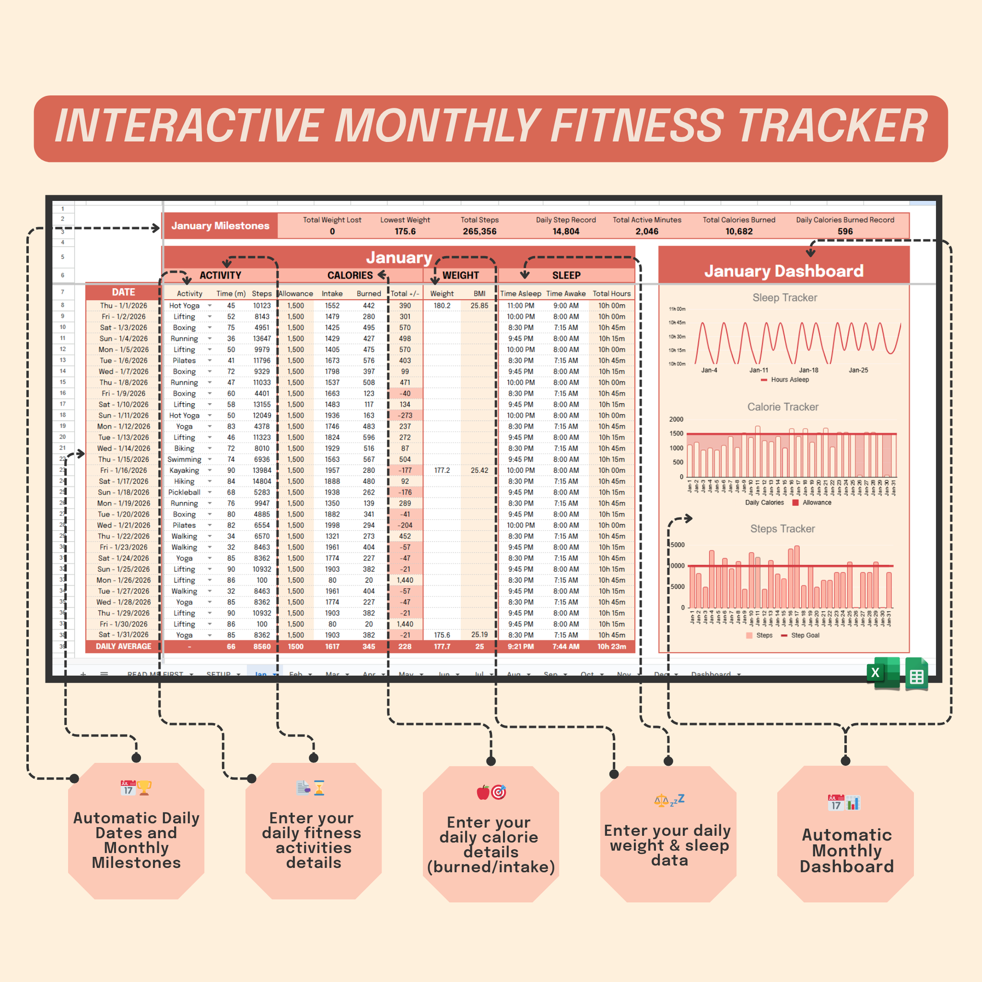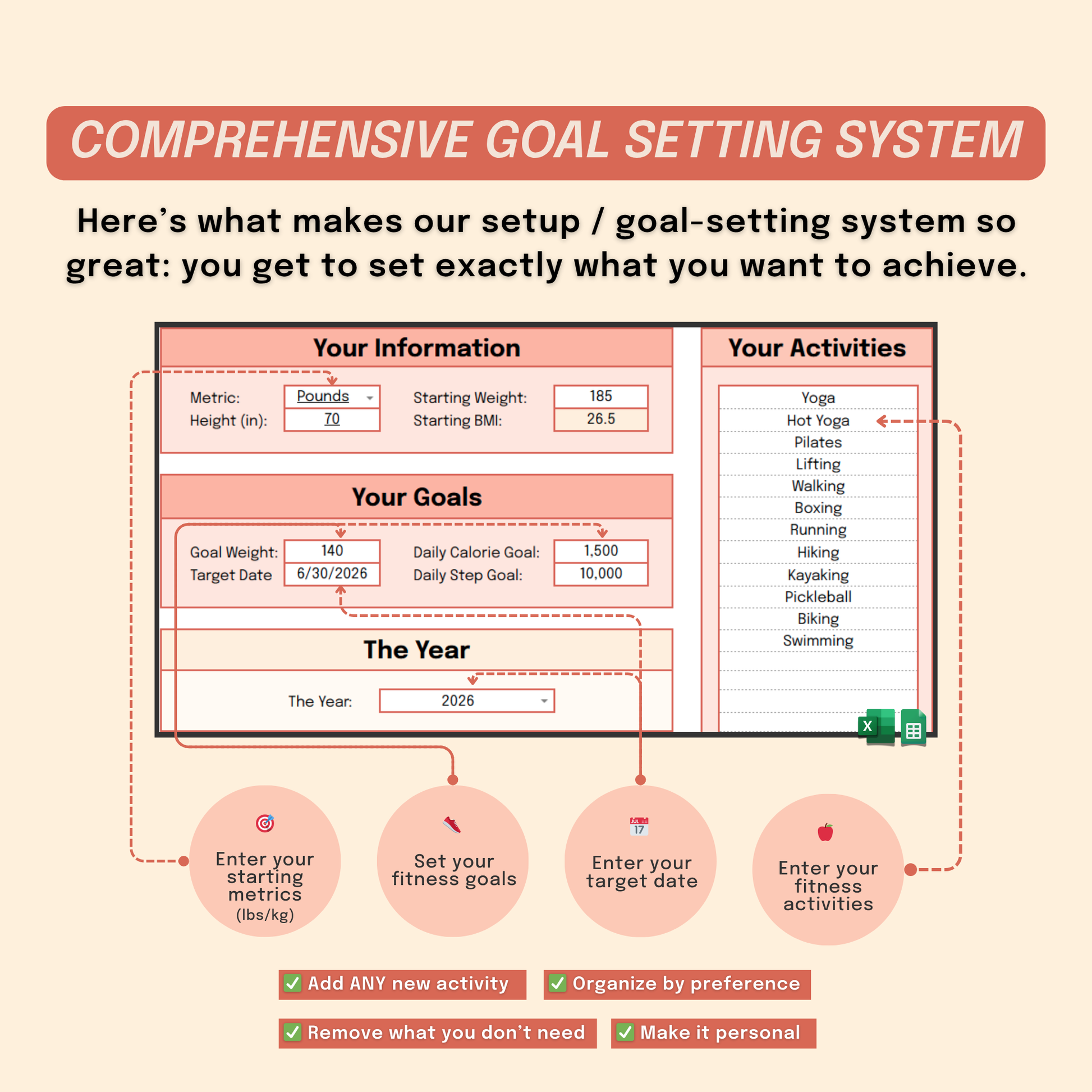 Transform your health in 2026 with my comprehensive Fitness Tracker. This all-in-one template helps you achieve total health transformation and actually stick to your fitness goals. It's straightforward: set your fitness goals, track your daily activities, and watch your complete health journey unfold! This brand-new tracker monitors everything from workouts to nutrition, weight progress, sleep patterns, and daily steps.